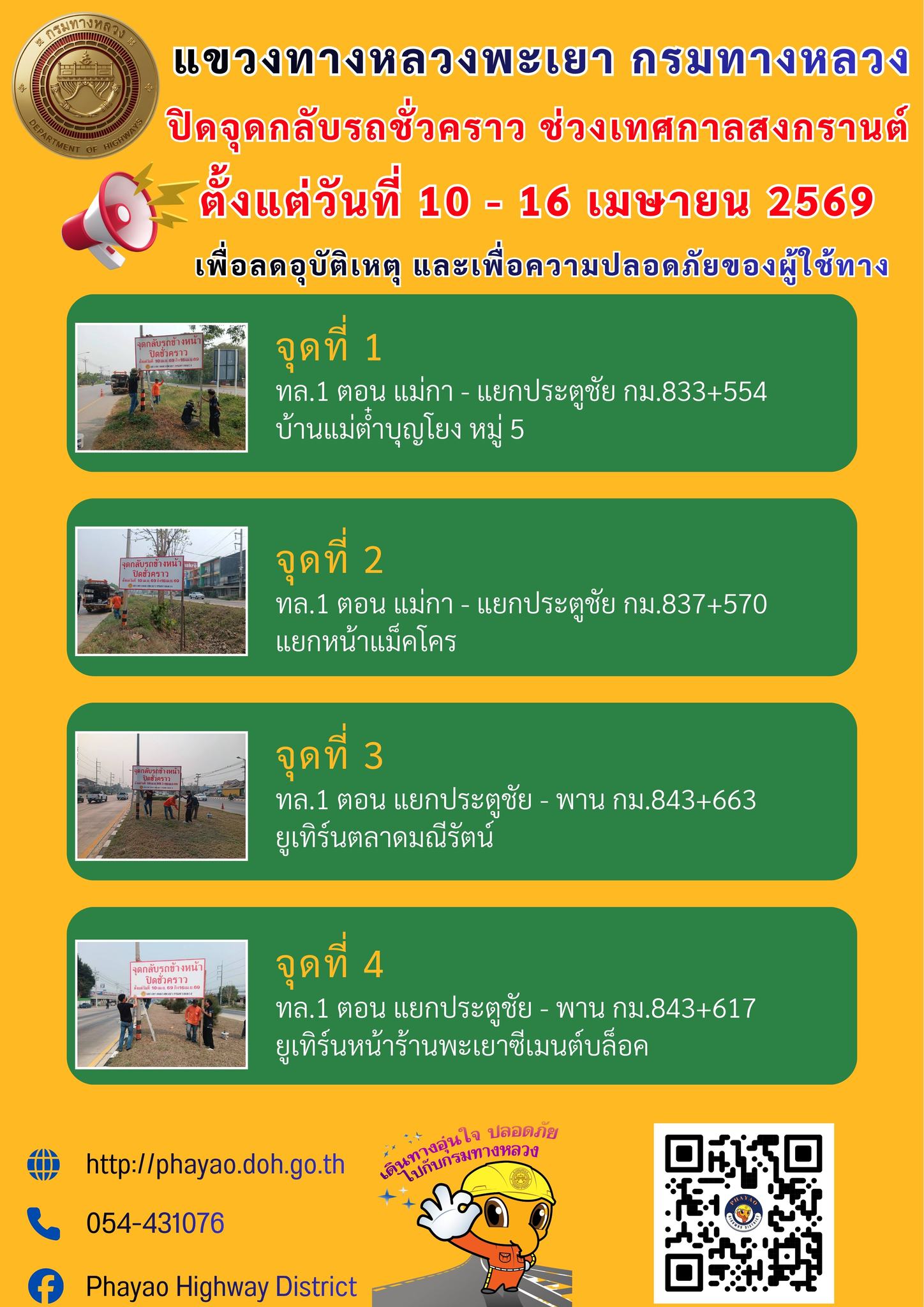 นายพูนศักดิ์ เมาะราษี ผู้อำนวยการแขวงทางหลวงพะเยา มอบหมายให้ นายวัชรพงษ์ ฟูเชื้อ หัวหน้างานอำนวยความปลอดภัย นำเจ้าหน้าที่ในสังกัดดำเนินการติดป้ายประชาสัมพันธ์ ปิดจุดกลับรถชั่วคราว ช่วงเทศกาลสงกรานต์ ประจำปี 2569 จำนวน 4 จุด
