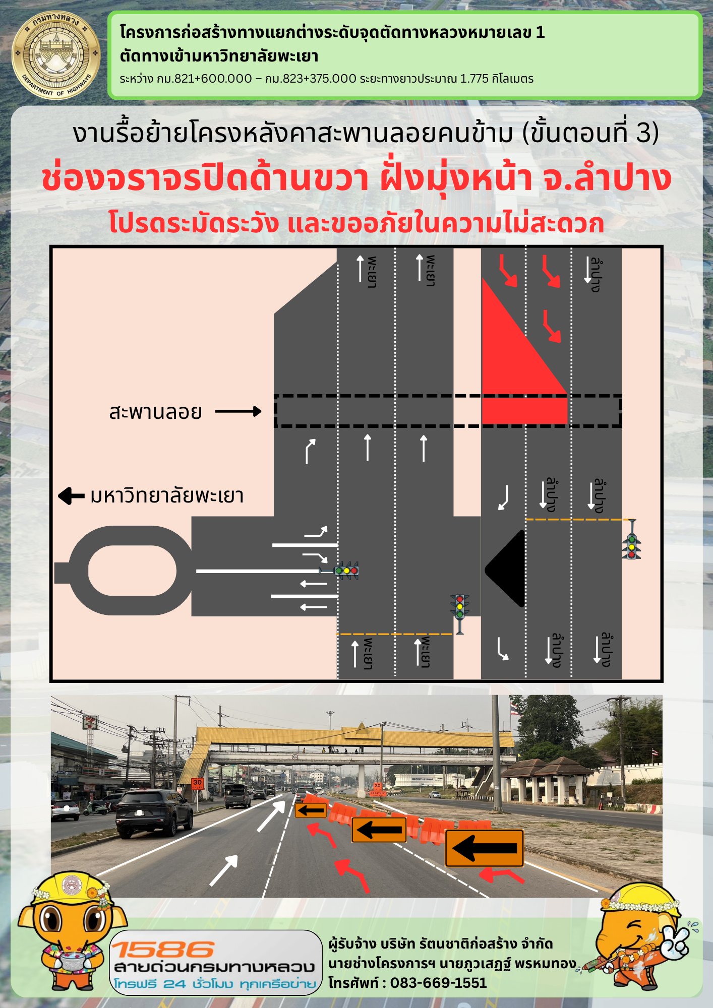 ข่าวประชาสัมพันธ์แขวงทางหลวงพะเยา เนื่องด้วยโครงการก่อสร้างทางแยกต่างระดับ จุดตัดทางหลวงหมายเลข 1 ตัดทางเข้ามหาวิทยาลัยพะเยา ทางหลวงหมายเลข 1 ตอน แม่กา - แยกประตูชัย ระหว่าง กม.821+600 - กม.823+375 จะดำเนินการถอดรื้อหลังคาสะพานลอย ในวันที่ 7 - 8 เมษายน 2569 จึงขอประชาสัมพันธ์งดใช้สะพานลอยคนเดินข้ามดังกล่าวชั่วคราว เป็นระยะเวลา 2 วัน เพื่อความปลอดภัยของผู้ใช้สะพาน และผู้ใช้เส้นทางสัญจร ดังกล่าว