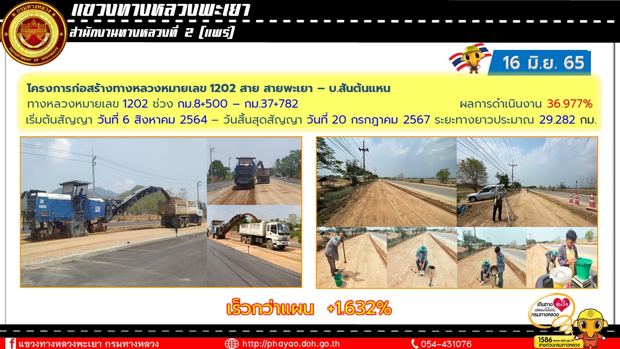 ความคืบหน้าโครงการก่อสร้างทางหลวงหมายเลข 1202 สาย สายพะเยา – บ.สันต้นแหน ช่วง กม.8+500 – กม.37+782 (เดือนมิถุนายน 2566)