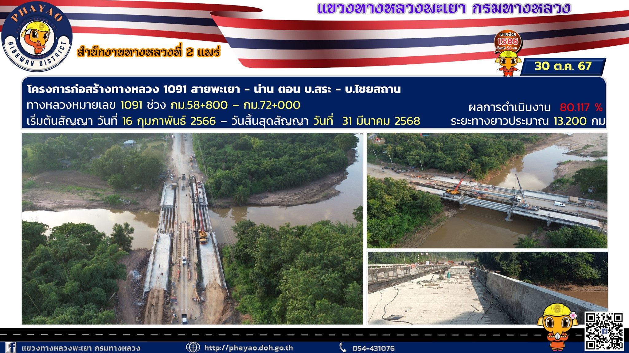 #ความคืบหน้า (เดือนตุลาคม 2567) โครงการก่อสร้างทางหลวง 1091 สายพะเยา - น่าน ตอน บ.สระ - บ.ไชยสถาน ทางหลวงหมายเลข 1091 ช่วง กม.58+800 – กม.72+000
