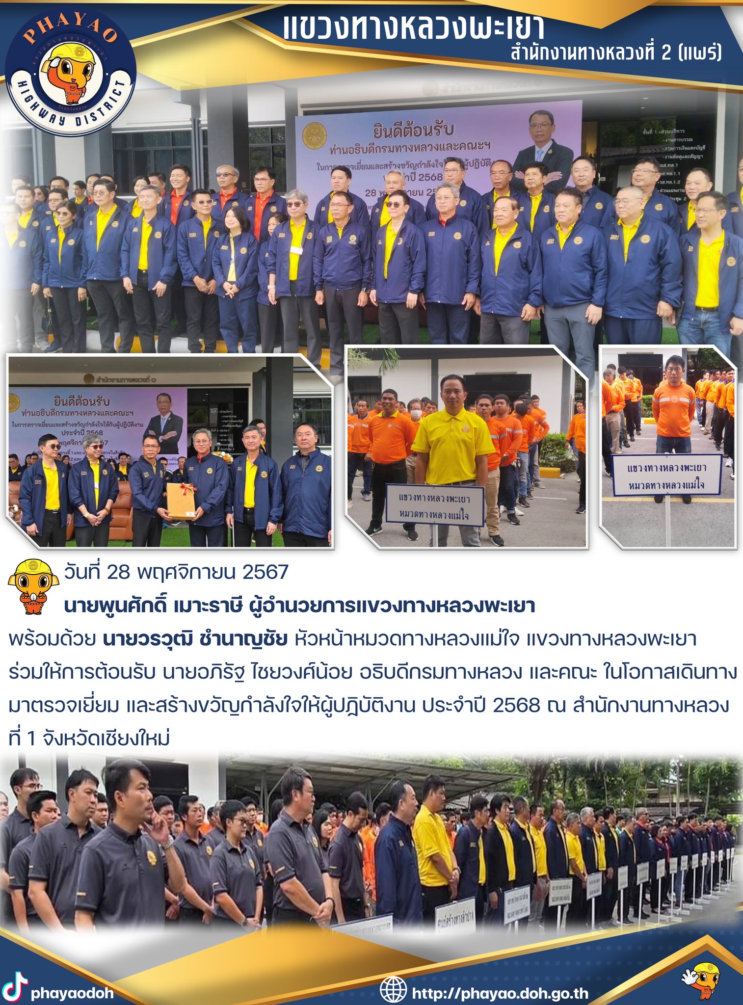 นายพูนศักดิ์ เมาะราษี ผู้อำนวยการแขวงทางหลวงพะเยา พร้อมด้วย นายวรวุฒิ ชำนาญชัย หัวหน้าหมวดทางหลวงแม่ใจ แขวงทางหลวงพะเยา ร่วมให้การต้อนรับ นายอภิรัฐ ไชยวงศ์น้อย อธิบดีกรมทางหลวง และคณะ ในโอกาสเดินทางมาตรวจเยี่ยม และสร้างขวัญกำลังใจให้ผู้ปฏิบัติงาน ประจำปี 2568 ณ สำนักงานทางหลวงที่ 1 จังหวัดเชียงใหม่