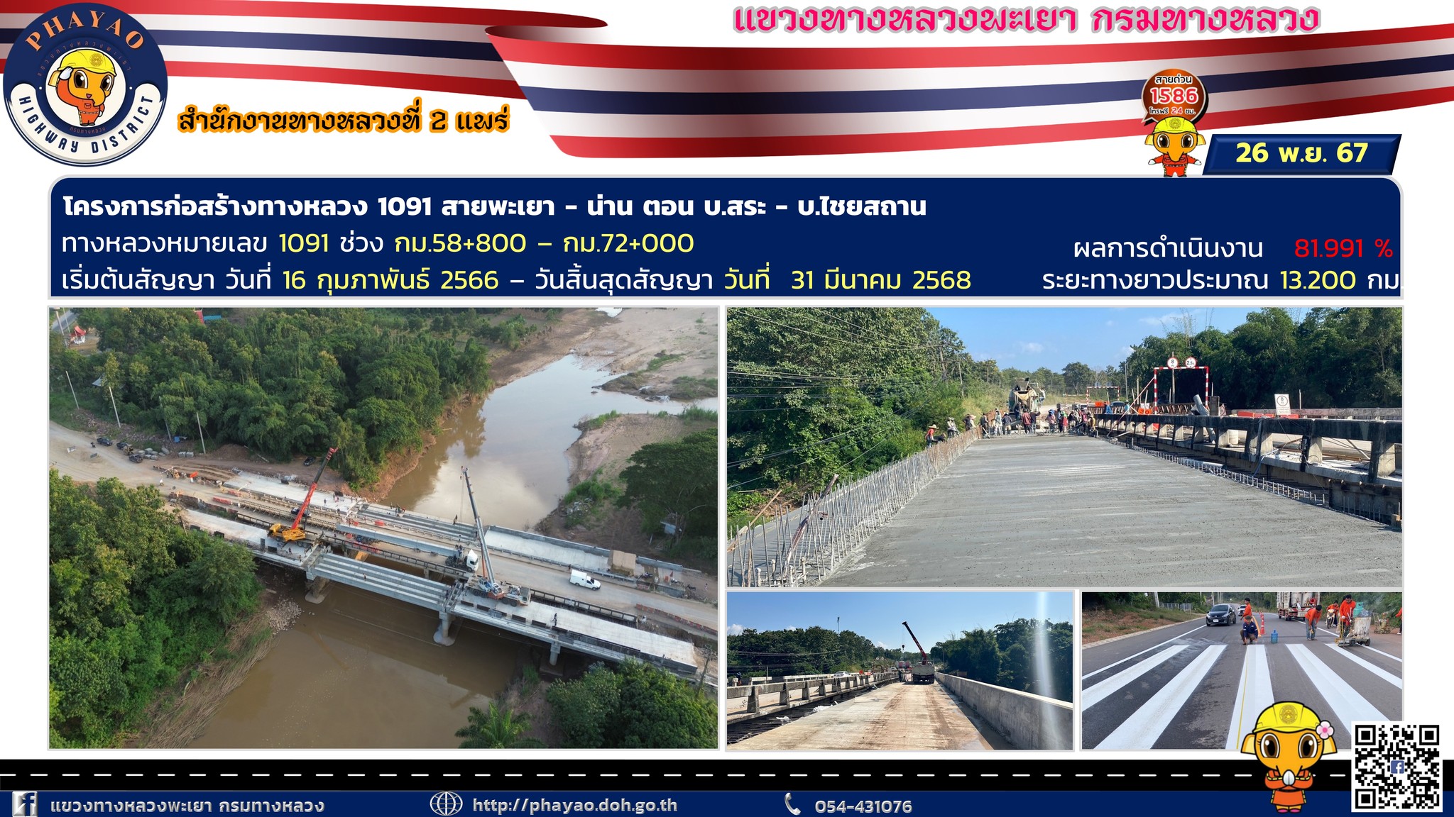 #ความคืบหน้า (เดือนพฤศจิกายน 2567)โครงการก่อสร้างทางหลวง 1091 สายพะเยา - น่าน ตอน บ.สระ - บ.ไชยสถาน ทางหลวงหมายเลข 1091 ช่วง กม.58+800 – กม.72+000