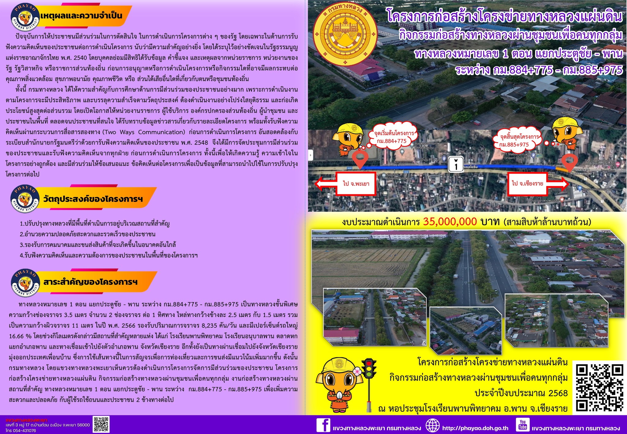 นายพูนศักดิ์ เมาะราษี ผู้อำนวยการแขวงทางหลวงพะเยามอบหมายให้ นายสมัย จันทร์ทัน รองผู้อำนวยการแขวงทางหลวงพะเยา ฝ่ายวิศวกรรม นางปิยนุช เมาลานนท์ หัวงานสารสนเทศ พร้อมด้วยหมวดทางหลวงแม่ใจ จัดการประชุมการมีส่วนร่วมของประชาชน โครงการก่อสร้างโครงข่ายทางหลวงแผ่นดิน กิจกรรมก่อสร้างทางหลวงผ่านชุมชนเพื่อคนทุกกลุ่ม ทางหลวงหมายเลข 1 ตอน แยกประตูชัย - พาน ระหว่าง กม.884+775 - กม.885+975