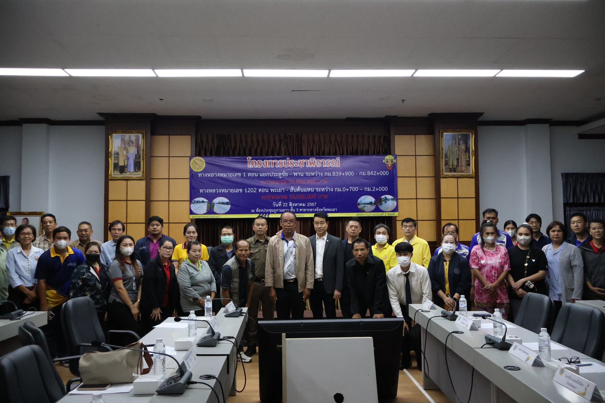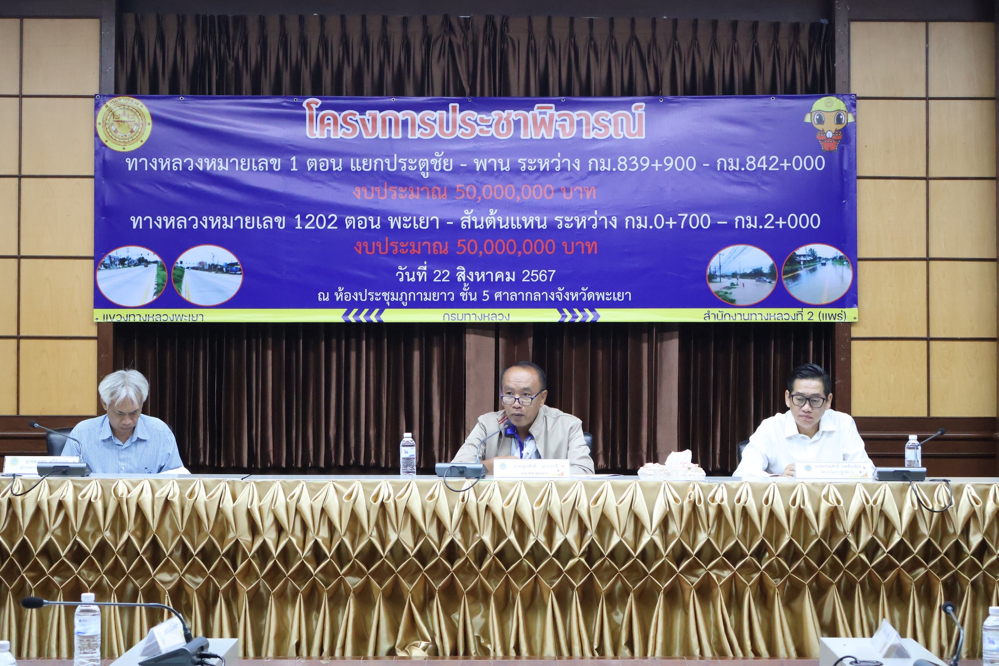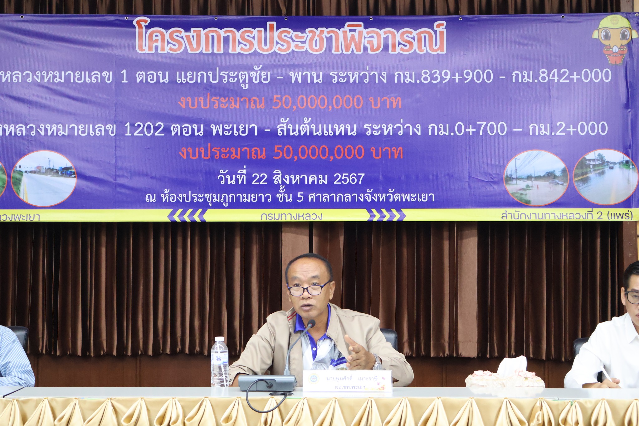 นายพูนศักดิ์ เมาะราษี ผู้อำนวยการแขวงทางหลวงพะเยา พร้อมด้วยเจ้าหน้าที่ในสังกัดแขวงทางหลวงพะเยา ได้ดำเนินการจัดโครงการประชาพิจารณ์ กิจกรรมบำรุงรักษาทางหลวง งานฟื้นฟูทางหลวง ทางหลวงหมายเลข 1 ตอน แยกประตูชัย - พาน ระหว่าง กม.839+900 - กม.842+000 และ ทางหลวงหมายเลข 1202 ตอน พะเยา - สันต้นแหน ระหว่าง กม.0+700 – กม.2+000