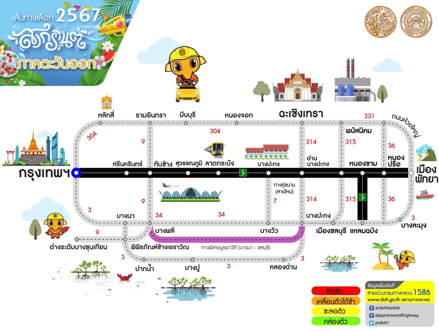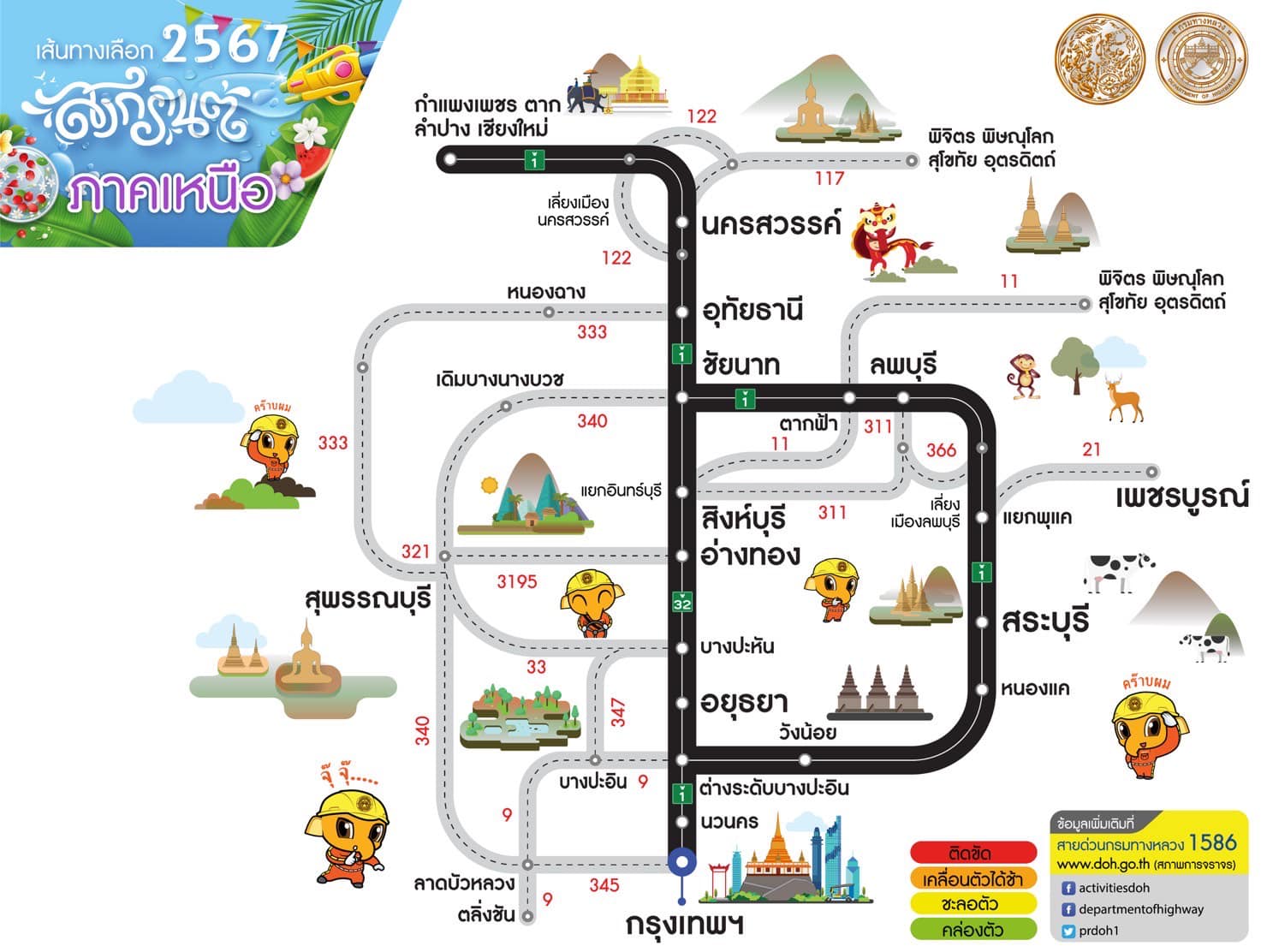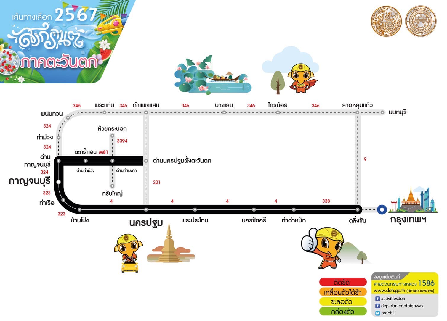 กรมทางหลวงแนะนำเส้นทางเลือกช่วงเทศกาลสงกรานต์ 2567 เพื่อให้ผู้ใช้ทางได้รับความสะดวกรวดเร็วในการเดินทาง สอบถามสภาพจราจรโทร 1586