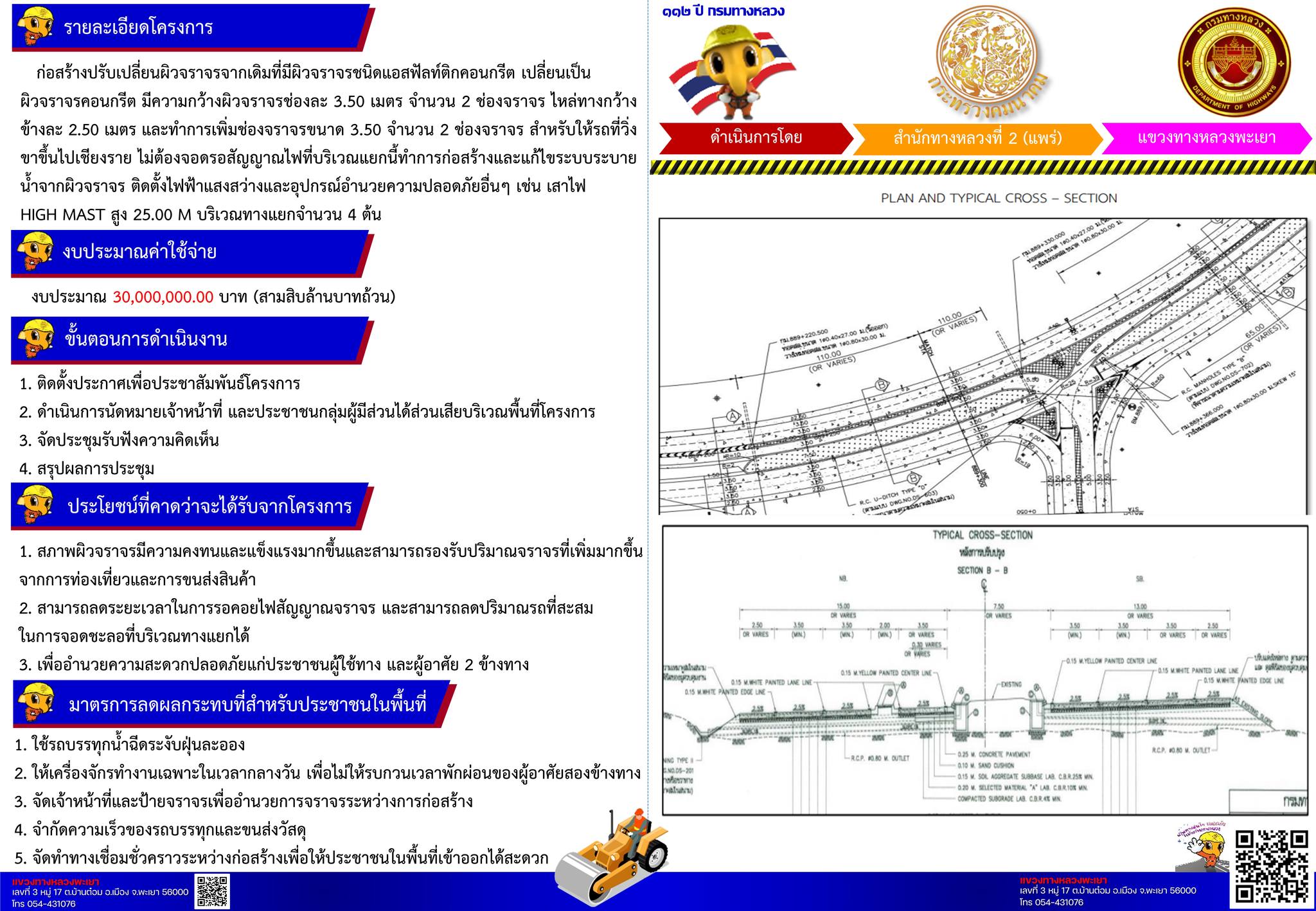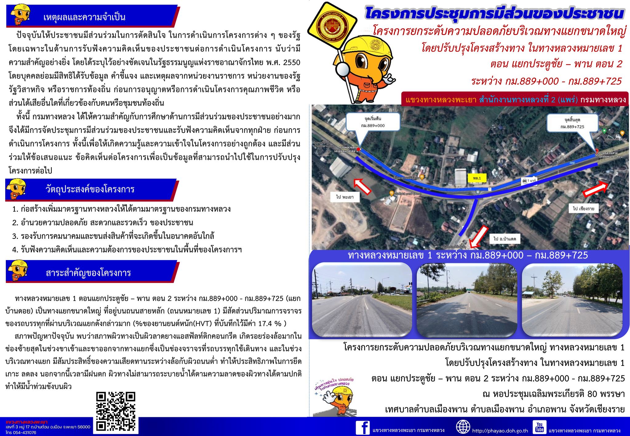 ขอเชิญชวนประชาชน ผู้ที่สนใจ เข้าร่วมประชุมการมีส่วนร่วมของประชาชน โครงการยกระดับความปลอดภัยบริเวณทางแยกขนาดใหญ่ โดยปรับปรุงโครงสร้างทาง ทางหลวงหมายเลข 1 ตอน แยกประตูชัย – พาน ตอน 2 ระหว่าง กม. 889+000 - กม. 889+725 ประจำปีงบประมาณ พ.ศ. 2567