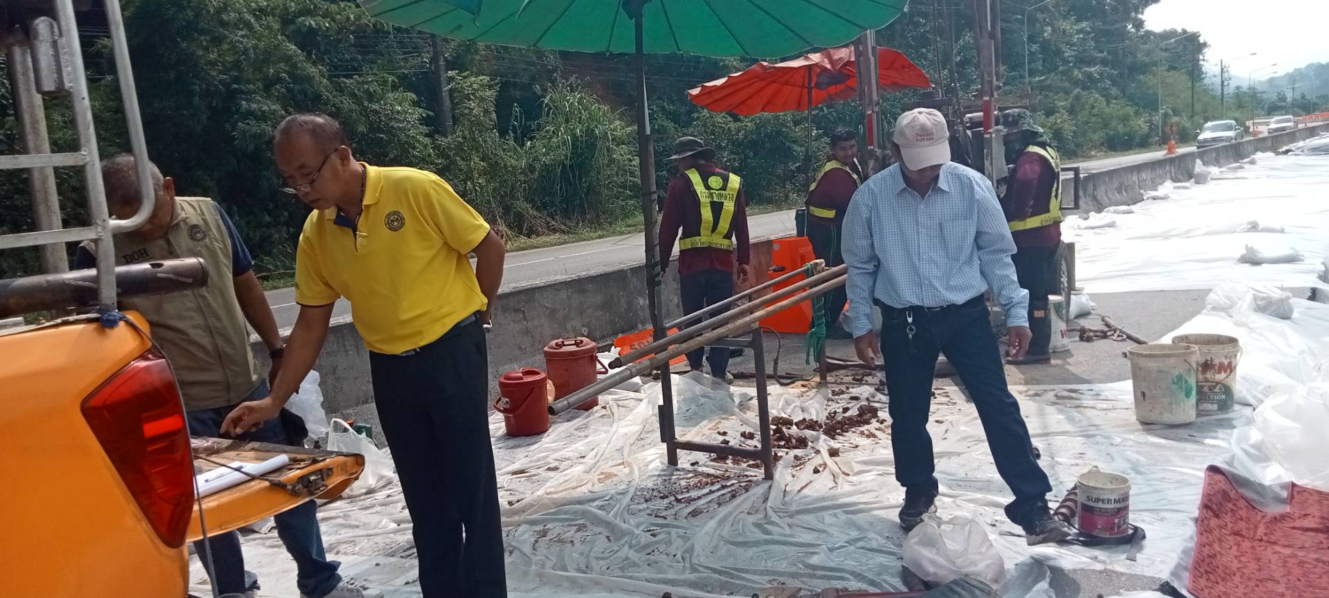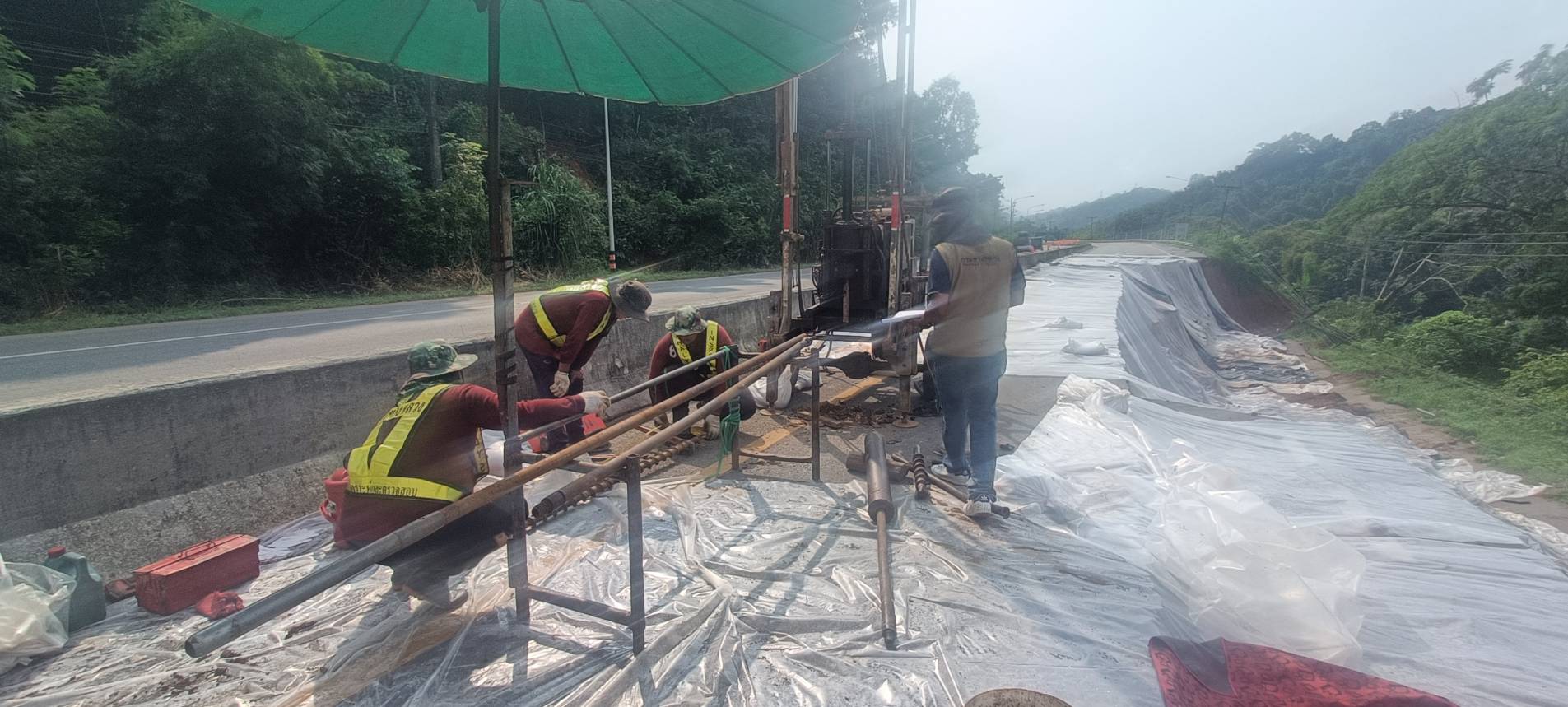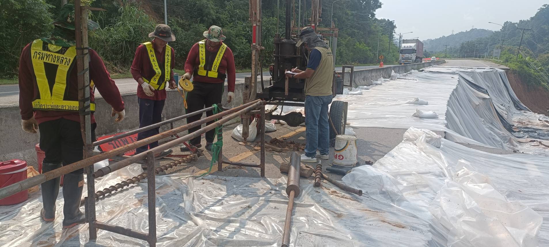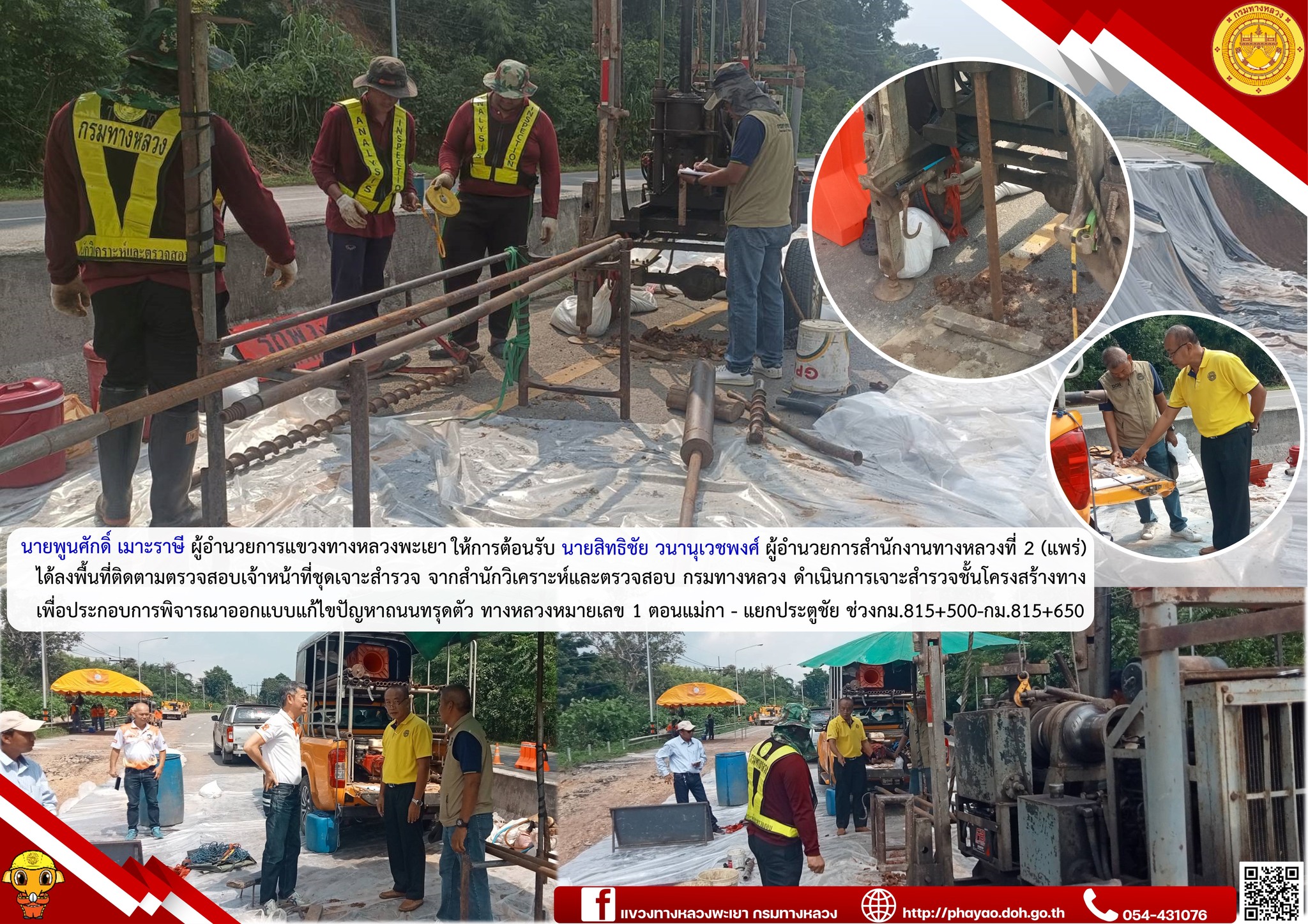 นายพูนศักดิ์ เมาะราษี ผู้อำนวยการแขวงทางหลวงพะเยา ให้การต้อนรับ นายสิทธิชัย วนานุเวชพงศ์ ผู้อำนวยการสำนักงานทางหลวงที่ 2 (แพร่) ได้ลงพื้นที่ติดตามตรวจสอบเจ้าหน้าที่ชุดเจาะสำรวจ จากสำนักวิเคราะห์และตรวจสอบ กรมทางหลวง ดำเนินการเจาะสำรวจชั้นโครงสร้างทางเพื่อประกอบการพิจารณาออกแบบแก้ไขปัญหาถนนทรุดตัว ทางหลวงหมายเลข 1 ตอนแม่กา - แยกประตูชัย ช่วงกม.815+500-กม.815+650
