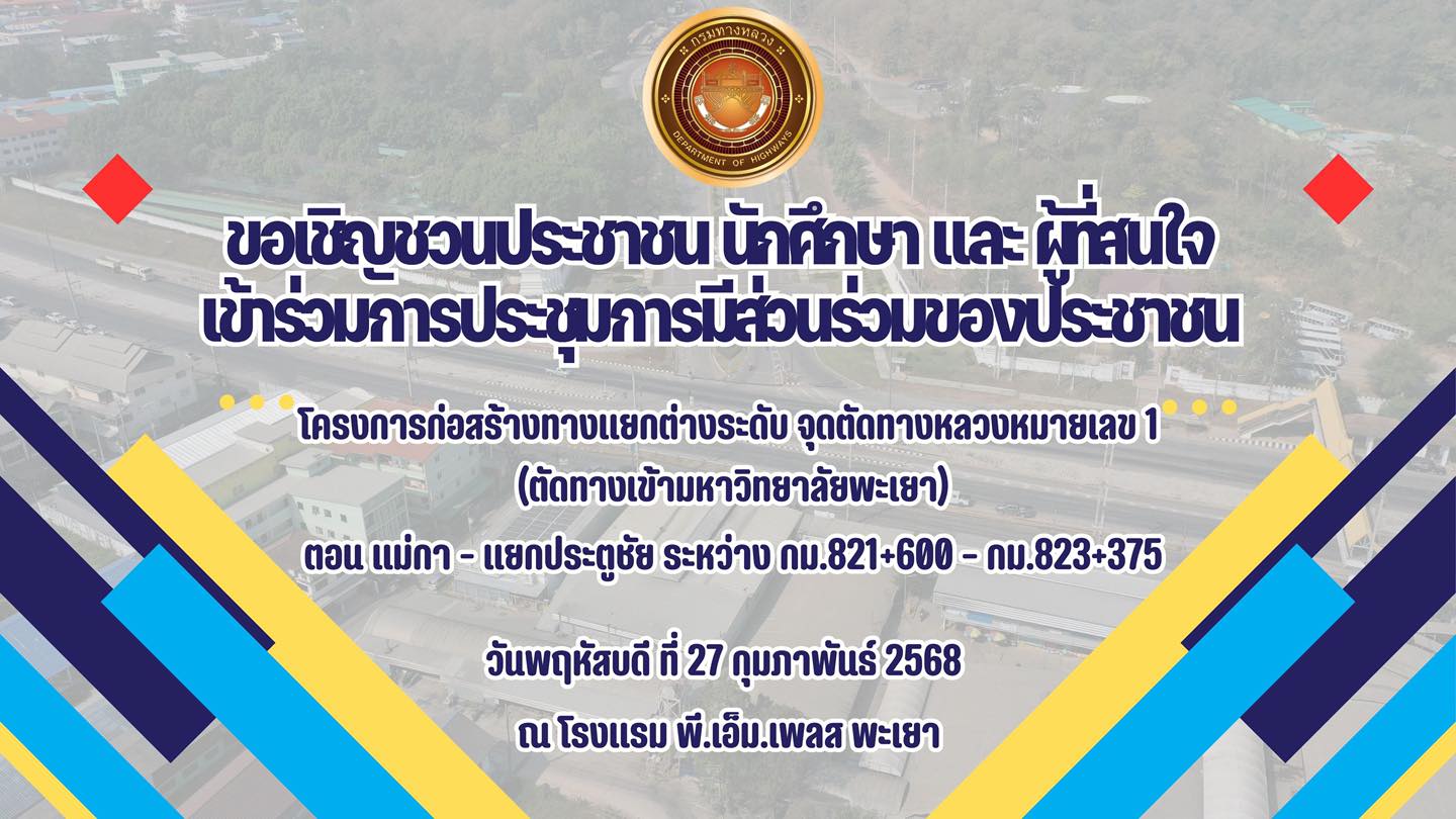 แขวงทางหลวงพะเยา จึงขอเชิญชวนประชาชน นักศึกษา และผู้ที่สนใจ เข้าร่วมการประชุมการมีส่วนร่วมของประชาชน ในวันพฤหัสบดี ที่ 27 กุมภาพันธ์ 2568 เวลา 08.30 น. เป็นต้นไป ณ โรงแรม พี.เอ็ม.เพลส พะเยา