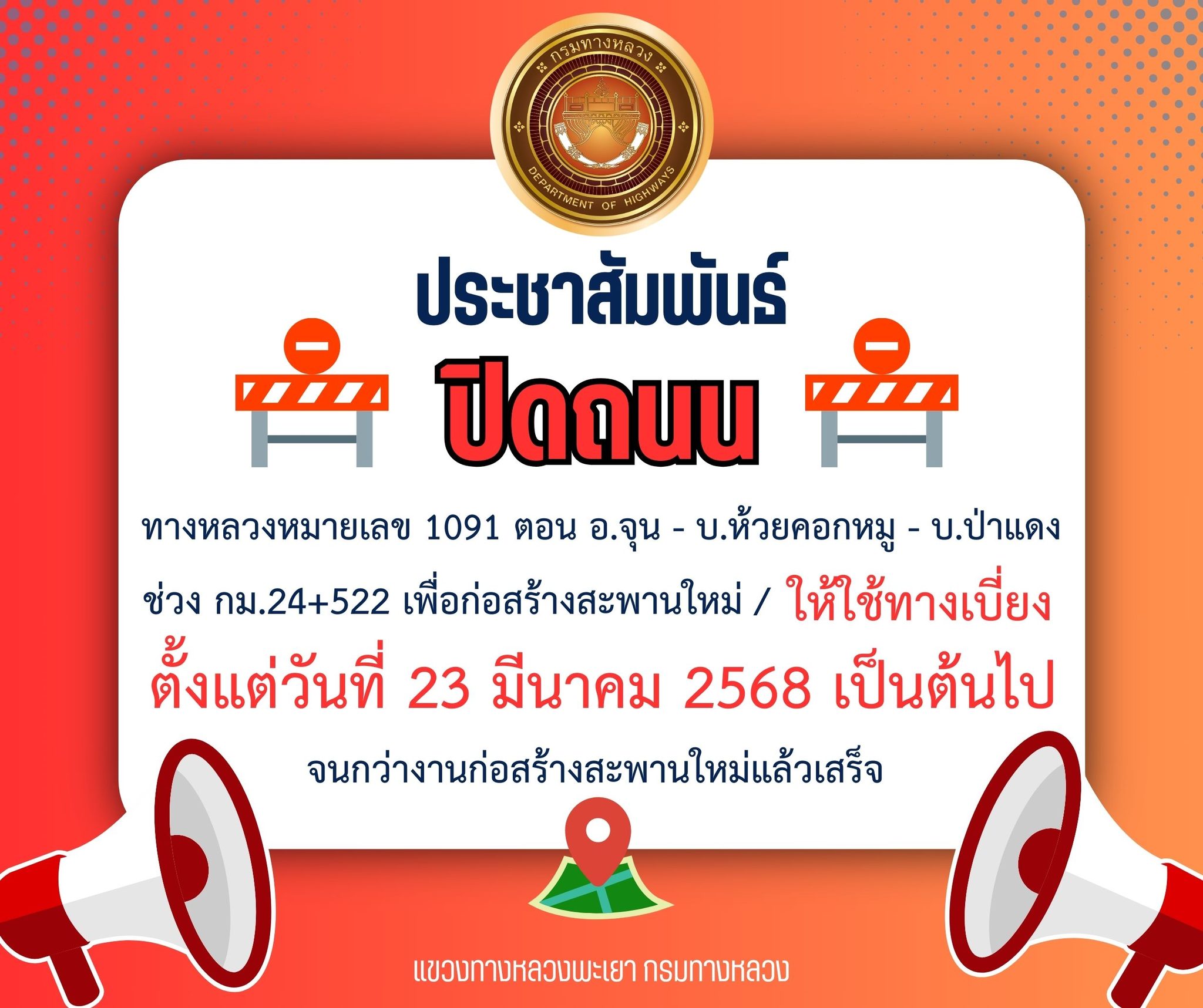 ด้วยโครงการก่อสร้างและบูรณะทางหลวงหมายเลข 1091 ตอน อ.จุน - บ.ห้วยคอกหมู - บ.ป่าแดง(ถนนสาน อ.จุน - อ.ปง) ในปีงบประมาณ 2568 มีงานรื้อทุบสะพานห้วยแม่แดง(เดิม) ช่วง กม.24+522 เพื่อก่อสร้างสะพานใหม่ ทั้งนี้โครงการฯ จะเริ่มปิดถนน เพื่อเบี่ยงการจราจรให้ประชาชนผู้ใช้เส้นทาง ไปใช้ทางเบี่ยง ตั้งแต่วันที่ 23 มีนาคม 2568 เป็นต้นไป จนกว่างานก่อสร้างสะพานใหม่แล้วเสร็จ