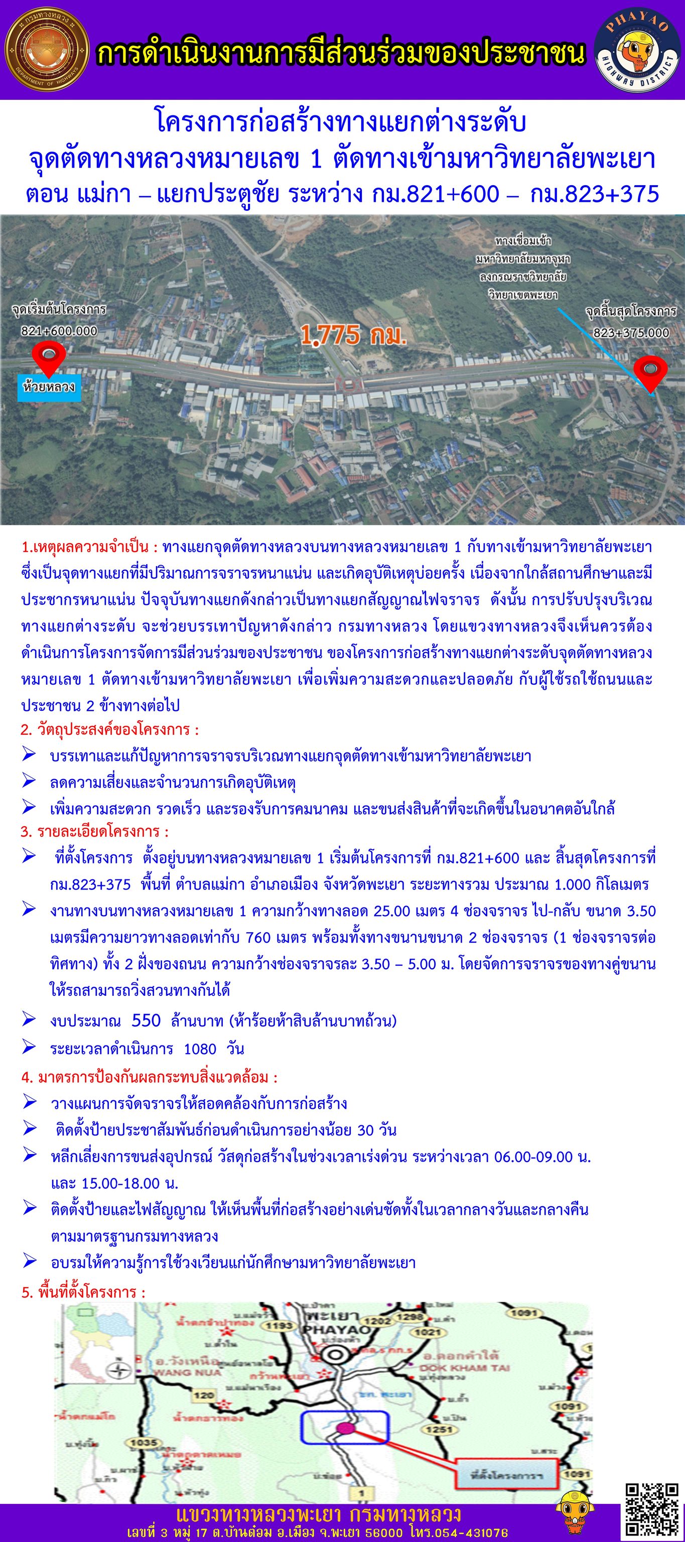 นายพูนศักดิ์ เมาะราษี ผู้อำนวยการแขวงทางหลวงพะเยา แจ้งความคืบหน้าโครงการก่อสร้างทางแยกต่างระดับ จุดตัดทางหลวงหมายเลข 1 (ตัดทางเข้ามหาวิทยาลัยพะเยา) ตอน แม่กา - แยกประตูชัย ระหว่าง กม.821+600 – กม.823+375