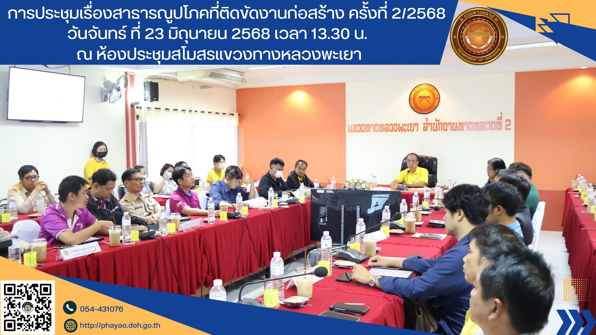 นายพูนศักดิ์ เมาะราษี ผู้อำนวยการแขวงทางหลวงพะเยา เป็นประธานการประชุมเรื่องสาธารณูปโภคที่ติดขัดงานก่อสร้าง ครั้งที่ 2/2568 ณ ห้องประชุมสโมสรแขวงทางหลวงพะเยา มีวาระการประชุมมีดังนี้