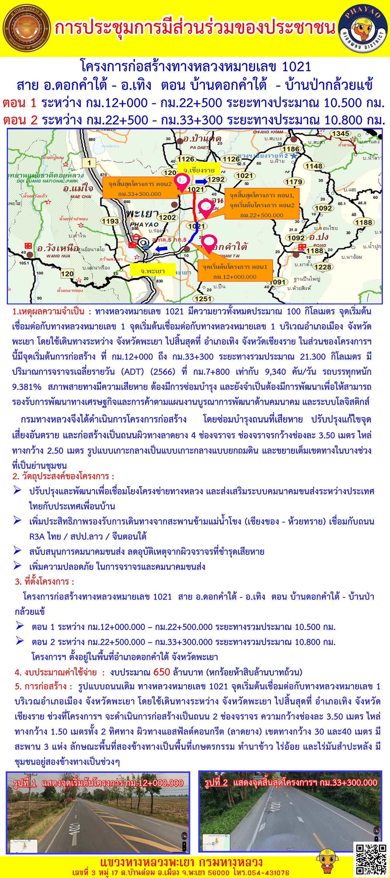 นายพูนศักดิ์ เมาะราษี ผู้อำนวยการแขวงทางหลวงพะเยา แจ้งความคืบหน้า โครงก่อสร้างทางหลวงหมายเลข 1021 สาย อ.ดอกคำใต้ - อ.เทิง ตอน บ้านดอกคำใต้ - บ้านใหม่กองแล - บ้านป่ากล้วยแข้