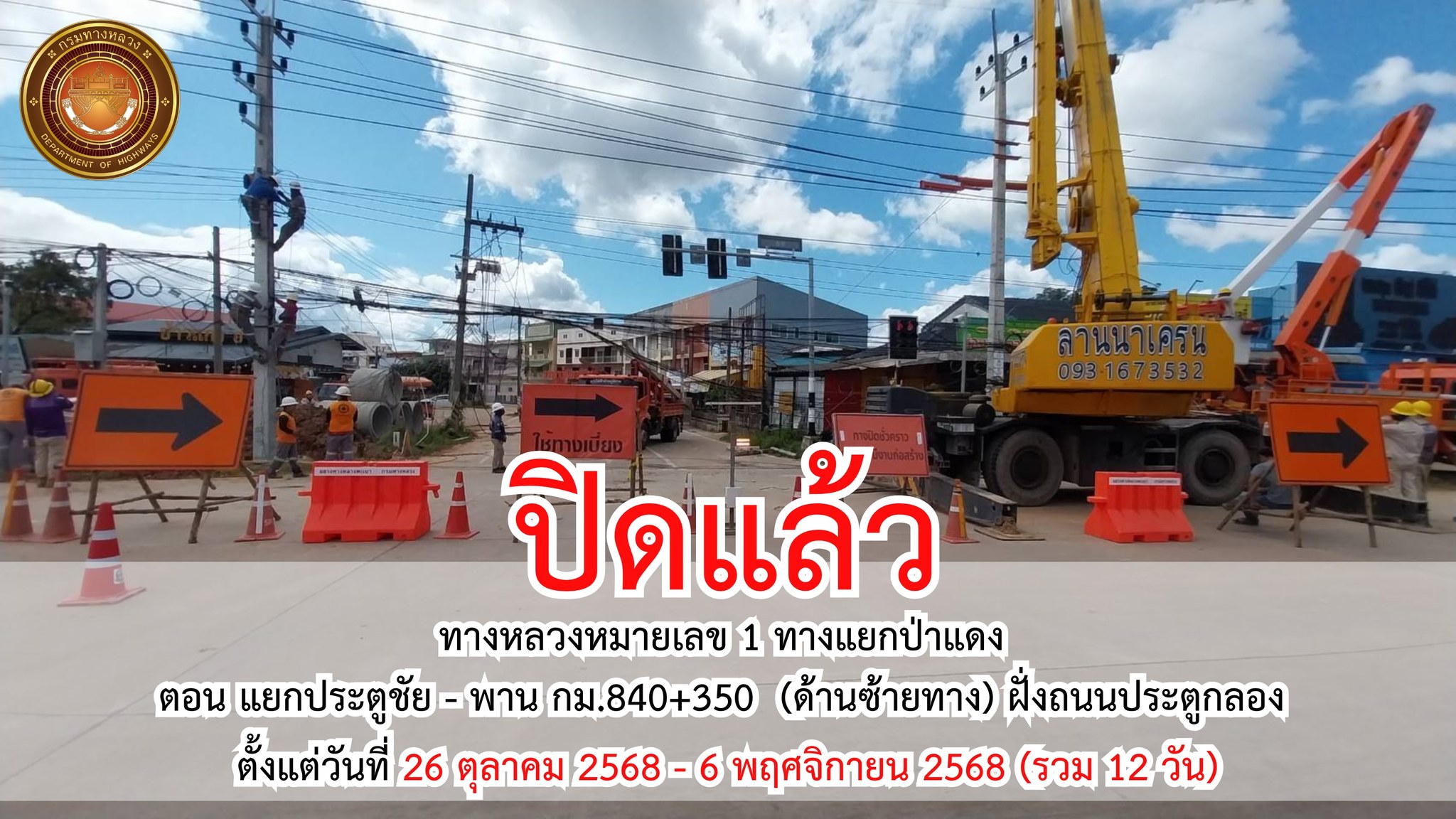 xปิดแล้วx...ทางแยกป่าแดง ทางหลวงหมายเลข 1 ตอน แยกประตูชัย - พาน กม.840+350 (ด้านซ้ายทาง) ฝั่งถนนประตูกลอง ตั้งแต่วันที่ 26 ตุลาคม 2568 - 6 พฤศจิกายน 2568 (รวม 12 วัน)
