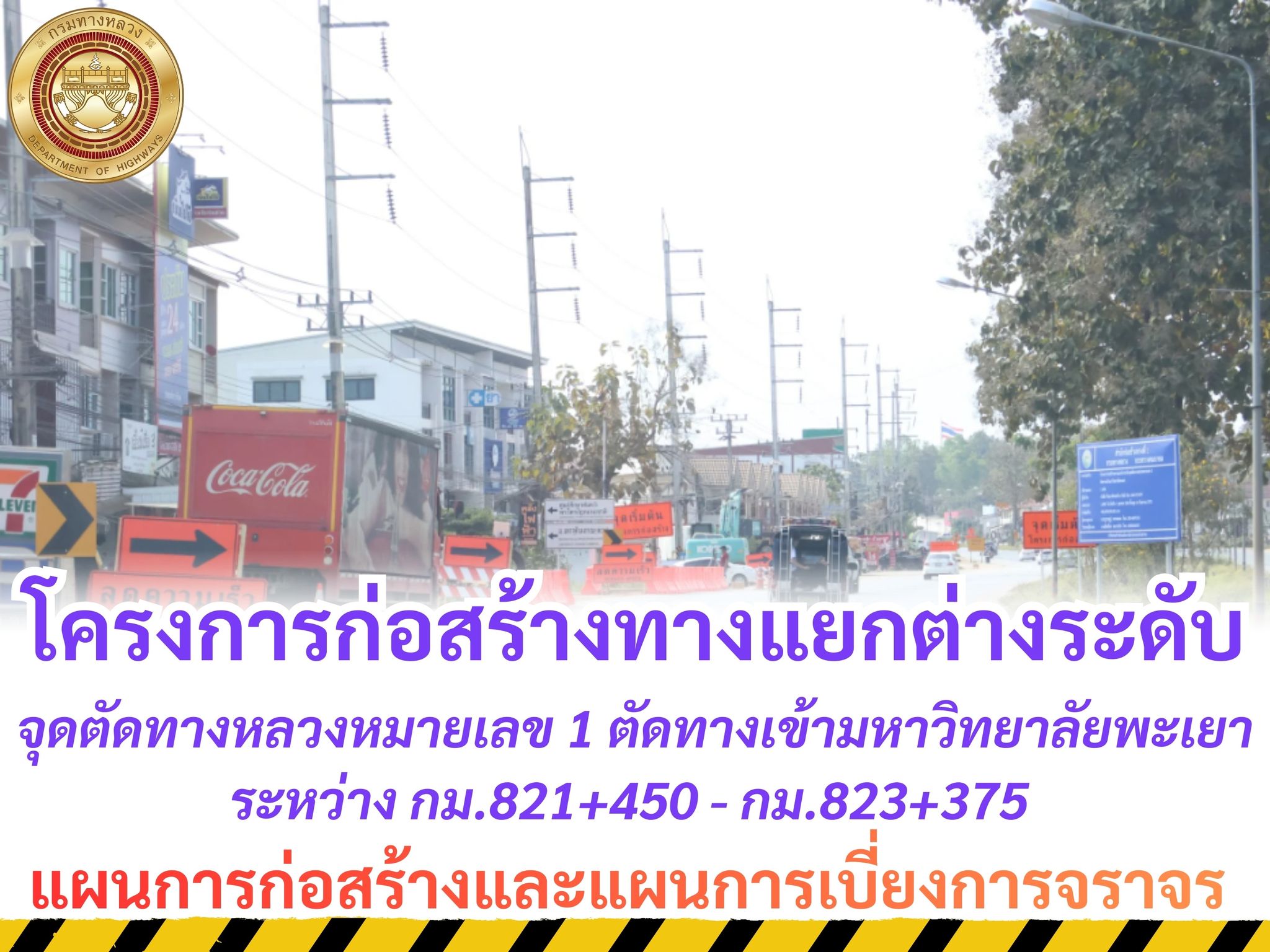 โครงการก่อสร้างทางแยกต่างระดับ จุดตัดทางหลวงหมายเลข 1 ตัดทางเข้ามหาวิทยาลัยพะเยา ตอนแม่กา - แยกประตูชัย ระหว่าง กม.821+450 - กม.823+375 (ระยะเวลาทำการ 1,080 วัน)