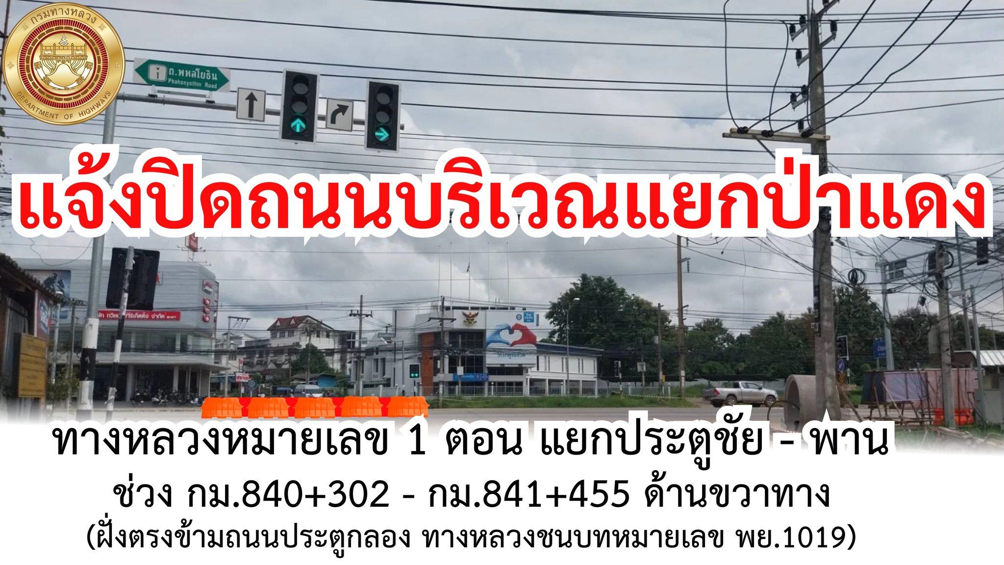 แจ้งปิดถนนบริเวณแยกป่าแดง ทางหลวงหมายเลข 1 ตอน แยกประตูชัย - พาน ช่วง กม.840+302 - กม.841+455 ด้านขวาทาง (ฝั่งตรงข้ามถนนประตูกลอง / ทางหลวงชนบทหมายเลข พย.1019) โดยการประปาส่วนภูมิภาคสาขาพะเยา จะดำเนินการย้ายแนวท่อประปา ขนาด 300 มม. ความยาวท่อ 12.00 เมตร พร้อมขุดกลบ และคืนสภาพผิวจราจรให้กลับสู่สภาพดีดังเดิม