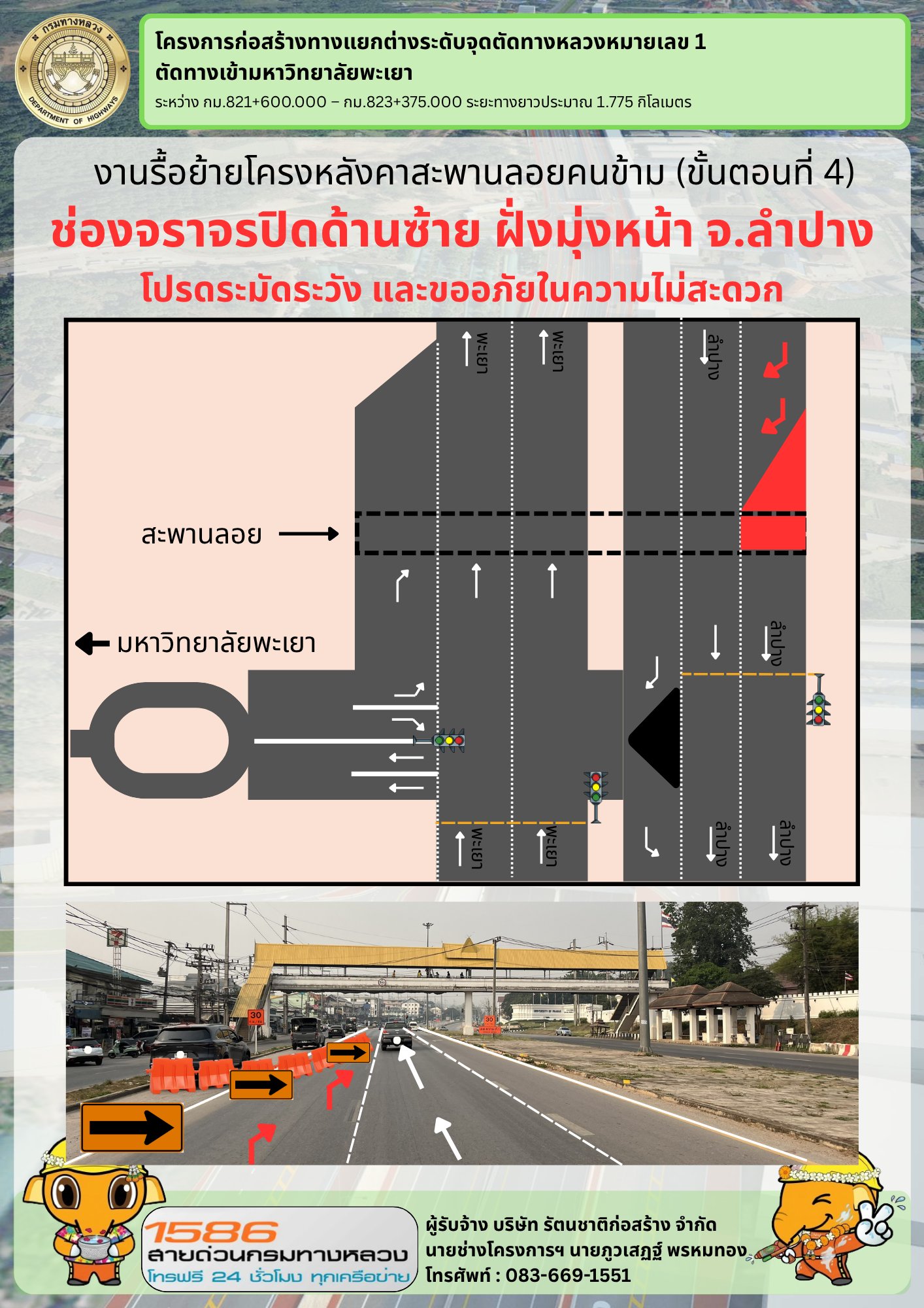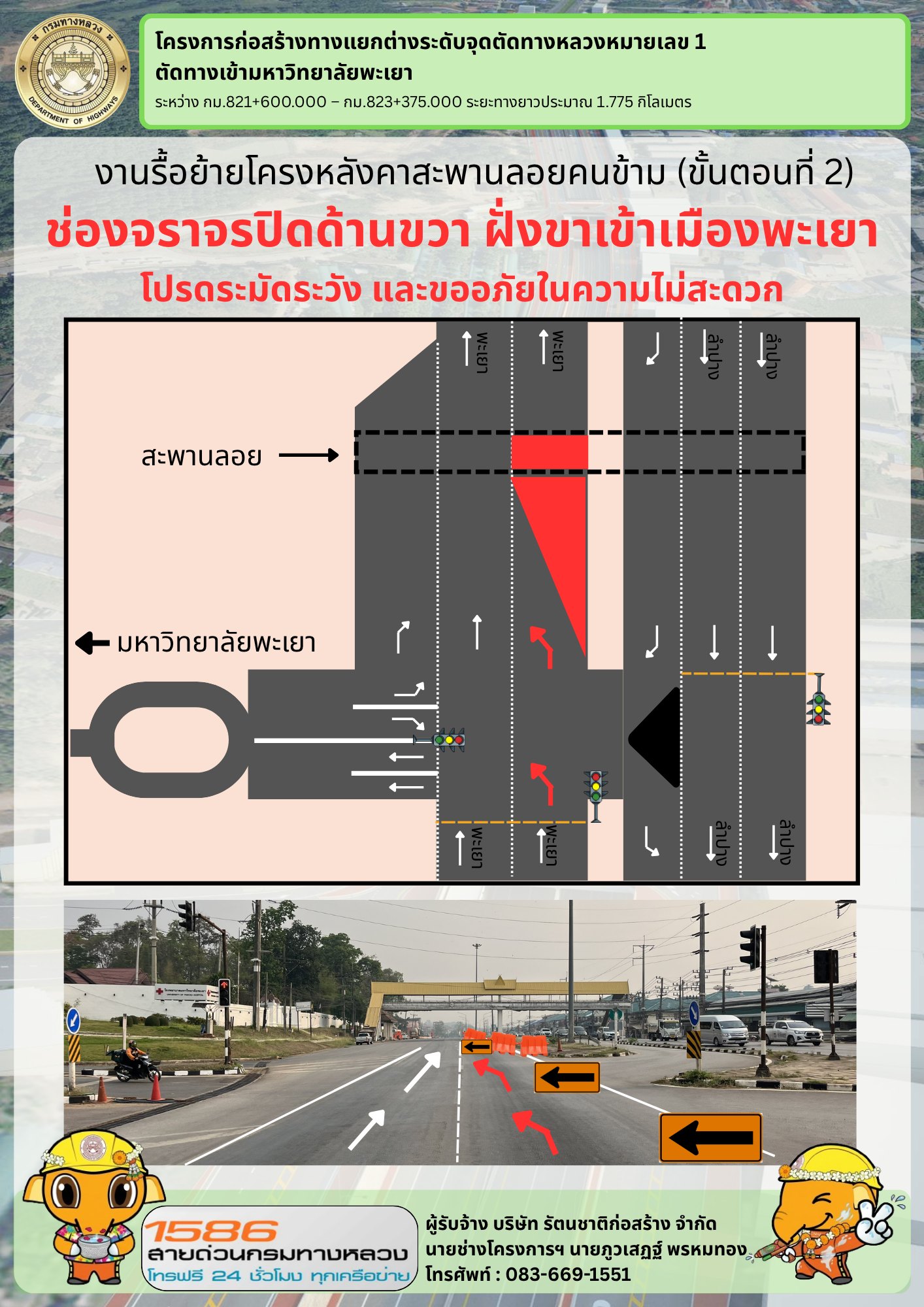 ข้อมูลข่าว : ข่าวประชาสัมพันธ์แขวงทางหลวงพะเยา เนื่องด้วยโครงการก่อสร้างทางแยกต่างระดับ จุดตัดทางหลวงหมายเลข 1 ตัดทางเข้ามหาวิทยาลัยพะเยา ทางหลวงหมายเลข 1 ตอน แม่กา - แยกประตูชัย ระหว่าง กม.821+600 - กม.823+375 จะดำเนินการถอดรื้อหลังคาสะพานลอย ในวันที่ 7 - 8 เมษายน 2569 จึงขอประชาสัมพันธ์งดใช้สะพานลอยคนเดินข้ามดังกล่าวชั่วคราว เป็นระยะเวลา 2 วัน เพื่อความปลอดภัยของผู้ใช้สะพาน และผู้ใช้เส้นทางสัญจร ดังกล่าว